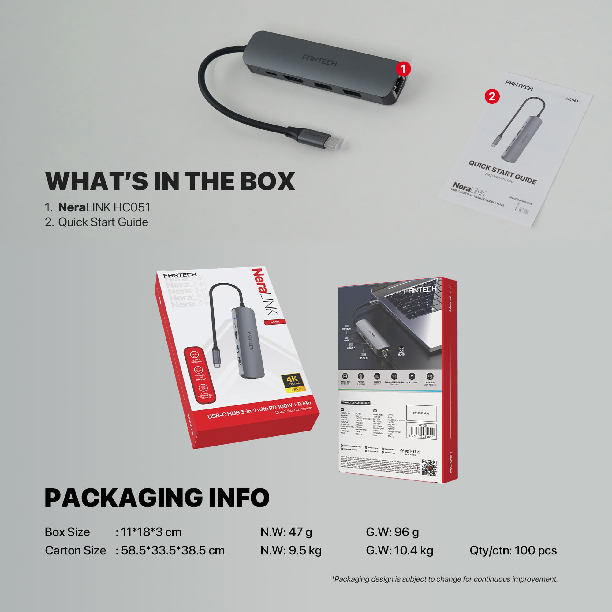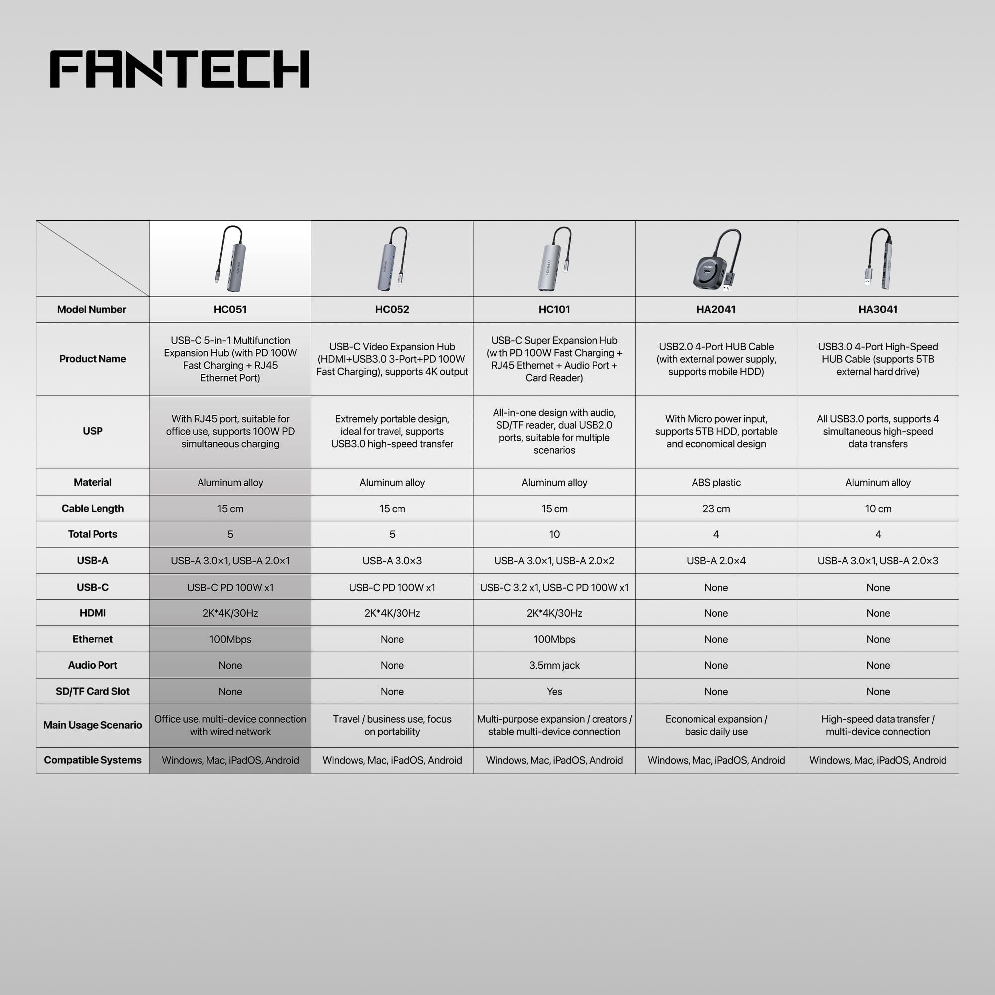 | Summary | FANTECH HC051 NeraLink 5-in-1 Multifunctional Docking Station HubThe FANTECH HC051 NeraLink 5-in-1 Multifunctional Docking Station Hub is a compact and powerful connectivity solution designed for modern USB-C devices. As part of FANTECH’s trusted NeraLink series, this hub expands a single USB-C port into multiple essential connections, making it ideal for professionals, students, and everyday users who need efficiency and flexibility.The NeraLink HC051 Docking Station features a well-balanced combination of ports for data transfer and peripheral connectivity. With USB-A 3.0 and USB-A 2.0 ports, it supports keyboards, mice, flash drives, and external devices while maintaining stable and efficient performance for daily multitasking.For display and network needs, the FANTECH NeraLink HC051 USB-C Hub includes an HDMI display output for external monitors or projectors and a 100Mbps Ethernet (RJ45) port for reliable wired internet access. This makes the NeraLink docking hub perfect for presentations, streaming, and office environments where stable connectivity is essential.Power management is seamless with the built-in PD 100W charging port, allowing your laptop or USB-C device to charge while using the hub. The NeraLink HC051 Docking Station Hub ensures uninterrupted productivity without sacrificing power or performance. Designed with a sleek aluminum body, the FANTECH HC051 NeraLink Docking Hub is durable, lightweight, and travel-friendly. Its plug-and-play functionality requires no drivers, making it a dependable and stylish companion for home, office, or on-the-go setups.✅ SPECIFICATIONS:* Brand: FANTECH* Model: HC051 5-in-1 Multifunctional Docking Station Hub* Material: Aluminum shell* Cable Length: ~15 cm* Weight: ~46 ± 2 g* Ports & Connectivity* USB-C Input Connector* USB 3.0 Port × 1* USB 2.0 Port × 1* HDMI/HDTV Port (HD Video Output)* RJ45 Ethernet Port (100Mbps)* PD Charging Port (100W)✅ Performance* Ethernet Speed: Up to 100 Mbps* Display Output: Supports high-quality HD (specification from manual)* USB Data Transfer: Standard USB 3.0/2.0 capabilities✅ Compatibility* Compatible with laptops, tablets, desktops, and USB-C devices supporting data and power pass-through✅ Warranty* 12-month manufacturer warranty (typical Fantech policy; please verify locally).. | FANTECH HC101 NeraLink 10-in-1 USB-C Multifunctional Docking Station HubThe FANTECH HC101 NeraLink 10-in-1 USB-C Multifunctional Docking Station Hub is a complete connectivity solution that transforms a single USB-C port into an all-in-one productivity center. Designed for professionals, creators, and everyday users, this NeraLink docking station expands your device’s capabilities with essential interfaces that support networking, displays, storage, and accessories.With the NeraLink HC101 hub, you get a robust combination of three USB-A ports (1 × USB 3.0, 2 × USB 2.0), two USB-C ports, and an additional USB-C charging port for versatile peripheral connections. These ports allow you to easily connect keyboards, mice, flash drives, external storage, and other USB devices without using multiple adapters. The NeraLink HC101 also includes a 4K@30Hz compatible HDMI/HDTV port, perfect for extending or mirroring your laptop’s display to a monitor or projector. Whether you’re presenting, streaming videos, or multitasking with multiple screens, reliable and clear visual output enhances productivity with stunning detail. For network needs, the RJ45 100Mbps Ethernet port offers a wired internet connection that’s stable and faster than Wi-Fi in many settings—ideal for online meetings, large file downloads, or remote working. Plus, built-in SD and TF card slots make retrieving photos, videos, and documents effortless right from your memory cards. The built-in PD 100W charging port ensures your USB-C laptop or compatible device stays powered while you use the hub, so you never have to sacrifice battery life for connectivity. The HC101’s sleek aluminum design is both stylish and durable, making it a portable productivity companion for home, office, or travel.✅ SPECIFICATIONS:* Brand: FANTECH* Series: NeraLink* Model: HC101* Type: 10-in-1 USB-C Multifunctional Docking Station Hub✅ Ports & Connectivity* 1 × HDMI/HDTV Port (Supports 4K @ 30Hz)* 1 × RJ45 Ethernet Port (100Mbps)* 1 × USB 3.0 Port (High-speed USB-A)* 2 × USB 2.0 Ports (USB-A standard devices)* 2 × USB-C Data Ports* 1 × USB-C PD Charging Port (Up to 100W)* 1 × SD Card Slot* 1 × TF Card Slot* 1 × 3.5mm Audio Jack (Audio connectivity)✅ Performance* Display Output: 4K @ 30Hz via HDMI* Ethernet: 100Mbps wired network* Data Compatibility: USB-A & USB-C peripherals* Plug-and-Play: No driver installation required✅ Physical* Material: Aluminum Shell* Cable Length: 15 cm* Weight: ~62 ± 2 g* Compact and portable for travel or work setups✅ Compatibility* Compatible with USB-C laptops, tablets, and devices supporting data/PD functions* Works with Windows, macOS, Linux systems✅ Warranty* 12-month official manufacturer warranty included (typical Fantech policy).. | FANTECH HC052 NeraLink 5-in-1 USB-C Multifunctional Docking Station HubThe FANTECH HC052 NeraLink 5-in-1 USB-C Multifunctional Docking Station Hub is an essential connectivity solution for modern USB-C laptops, tablets, and mobile devices. Designed to expand your device’s capabilities, this NeraLink hub turns a single USB-C port into multiple useful interfaces—perfect for professionals, students, and multimedia users who demand efficiency and convenience.With the NeraLink HC052 Docking Station, you get three USB 3.0 ports that allow fast and reliable connections for keyboards, mice, flash drives, external hard drives, and other USB-enabled peripherals. These high-speed USB ports ensure consistent performance for data transfers and device management. The FANTECH NeraLink HC052 Hub also includes a dedicated HDTV port with support for crisp video output up to 4K@30Hz. Connect