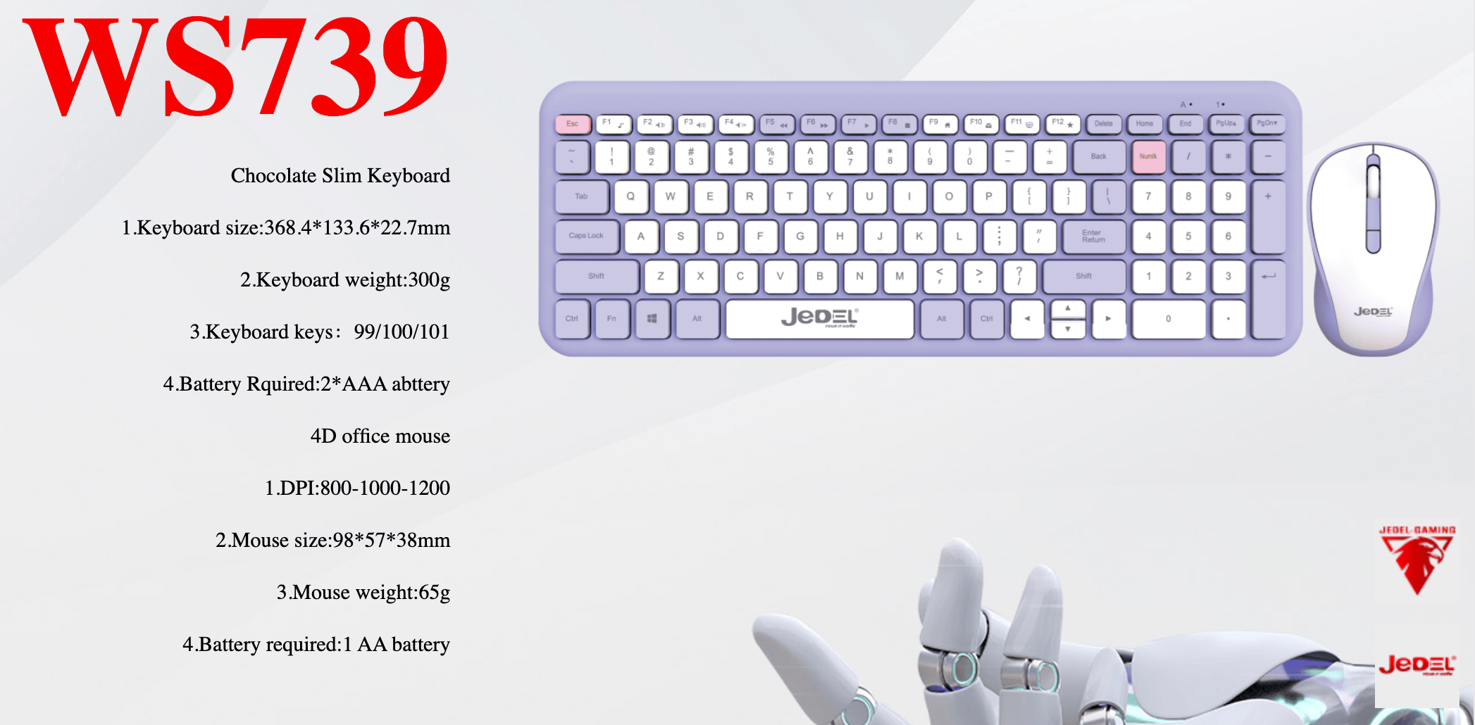 | Summary | JEDEL WS739 Dual-Mode Wireless Keyboard & Mouse Combo✅ The JEDEL WS739 Dual-Mode Keyboard & Mouse Combo is designed for users who value versatility, efficiency, and comfort in everyday computing. With both Bluetooth and 2.4GHz wireless connectivity, it offers seamless switching between devices, making it perfect for multitasking across laptops, desktops, tablets, and smart devices. Its dual-mode capability ensures lag-free, stable performance for work, study, and home use.✅ The keyboard features a Chocolate Slim Key design that delivers a soft, quiet, and comfortable typing experience. Its compact size of 368.4×133.6×22.7mm ensures it fits well on any desk while maintaining a sleek, modern look. With 99/100/101 keys depending on layout, users experience full functionality within a space-saving footprint. Weighing only 300g, it's lightweight and easy to carry.✅ Powered by 2×AAA batteries, the keyboard is engineered for long-lasting, energy-efficient performance. Its ultra-slim design makes it ideal for office workers, students, or travelers who need a clean, minimal, and portable typing solution. Whether typing emails, documents, or browsing online, the keyboard ensures smooth input and reliable key response—perfect for long work sessions or everyday computing tasks.✅ The included 4D office mouse enhances productivity with three adjustable DPI levels: 800, 1000, and 1200. This allows users to fine-tune cursor precision based on workload—ideal for spreadsheets, creative tasks, or general browsing. Its ergonomic size of 98×57×38mm and lightweight 65g body ensure comfortable usage during extended sessions, reducing hand fatigue while maintaining accuracy.✅ Designed for maximum convenience, the mouse runs on 1 AA battery, offering strong energy efficiency and dependable wireless connectivity. With both devices supporting dual-mode operation, the JEDEL WS739 combo provides a clutter-free, flexible workflow. Whether for office productivity, online meetings, or casual home use, this combo delivers a smooth, responsive, and reliable computing experience across multiple platforms.✅ TECHNICAL SPECIFICATIONS* * Keyboard* Chocolate Slim Keyboard* Keyboard Size: 368.4*133.6*22.7mm* Keyboard Weight: 300g* Keyboard Keys: 99/100/101* Battery Rquired: 2*AAA abttery* * Mouse* 4D office mouse* DPI:800-1000-1200* Mouse Size: 98*57*38mm* Mouse Weight: 65g* Battery required: 1 AA battery* Warranty: 12 Month.. | JEDEL WS681B Wireless Bluetooth Office Mouse and Keyboard ✅ Upgrade your productivity with the JEDEL WS681B Wireless Bluetooth Office Mouse and Keyboard combo. Designed for seamless multitasking and modern efficiency, this sleek, ultra-responsive set features whisper-quiet keys and an ergonomic mouse for all-day comfort. With stable Bluetooth connectivity and a clutter-free wireless design, the WS681B combo is perfect for professional environments, home offices, or anyone looking to streamline their workflow. ✅ Whether you're drafting documents, crunching numbers, or attending virtual meetings, the JEDEL WS681B offers a fluid typing and navigation experience that keeps pace with your productivity. With its modern design and dependable performance, it's the ideal upgrade for those who value both style and function. ✅ Responsive, low-profile keys for quiet, efficient typing✅ Ergonomic wireless mouse with smooth tracking✅ Dual-mode connectivity: Bluetooth + 2.4GHz wireless receiver✅ Long battery life for uninterrupted use✅ Slim, modern design to complement any workspace* Connectivity: Wireless Bluetooth (Supports Windows, macOS, Android, and iOS)* Mouse DPI: 1600 DPI, 4 Silent Switch Buttons with 3 Million Click Lifespan* Keyboard Type: Full-size 104 Keys with Numeric Keypad and Multimedia Function Keys* Battery: Keyboard: 1×AAA (not included), Mouse: 2×AAA (not included) Keyboard Type: Full-sized wireless keyboard (2.4GHz) Number of Keys: 104 (Color keycap) Layout: Includes numeric keypad and multimedia function keys Dimensions: 452 × 175 × 25.3 mm Weight: Approximately 588.5g Battery: 2 × AAA batteries (not included) Wireless Range: Up to 10 meters Compatibility: Windows, macOS, Android, and iOS devices Features: Slim profile, quiet membrane keys, automatic sleep mode for power saving Mouse Specifications Type: 3D wireless mouse DPI: 1600 Buttons: 4 silent switches with a lifespan of 3 million clicks Dimensions: 108 × 59.5 × 28.5 mm Battery: 1 × AAA battery (not included) Material: ABS plastic Features: Ultra-thin design, high sensitivity, on/off switch at the bottom .. | Fantech KM103 Usb Wired Keyboard And Mouse Combo ✅ Simplify your workspace with the FANTECH KM103 USB Wired Keyboard and Mouse Combo, designed to deliver reliable performance for both work and casual gaming. This cost-effective duo is perfect for home, office, or educational use, offering comfort, durability, and seamless plug-and-play functionality. ✅ With a full-sized keyboard featuring soft keys and a responsive optical mouse, the KM103 combo ensures efficient and comfortable use for long hours of typing or gaming. Features and Benefits ✅ Full-Sized Keyboard with soft and quiet keys for comfortable typing✅ Responsive Optical Mouse for precise tracking and smooth navigation✅ Plug-and-Play Setup—simply connect via USB, no drivers required✅ Durable Build Quality to withstand daily use✅ Ergonomic Design for extended comfort during work or play✅ Compatible with Multiple Devices—PCs, laptops, and more✅ Long Cable Length for flexible desktop arrangements ✅ Specification Comport Hand Anti Splash Design Ultra Smooth Typing Number of Keys: 104 Key Design Optical Tracking with Precise Positioning Spill-Resistant Keyboard Plug and Play Clear and Legible Keys Size: 440 x 150 x 24 mm Weight: 484 g Mouse Number of Buttons: 3 Buttons .. | JEDEL WS671 Wireless Keyboard and Mouse Combo ✅ Experience unparalleled convenience and performance with the JEDEL WS671 Wireless Key