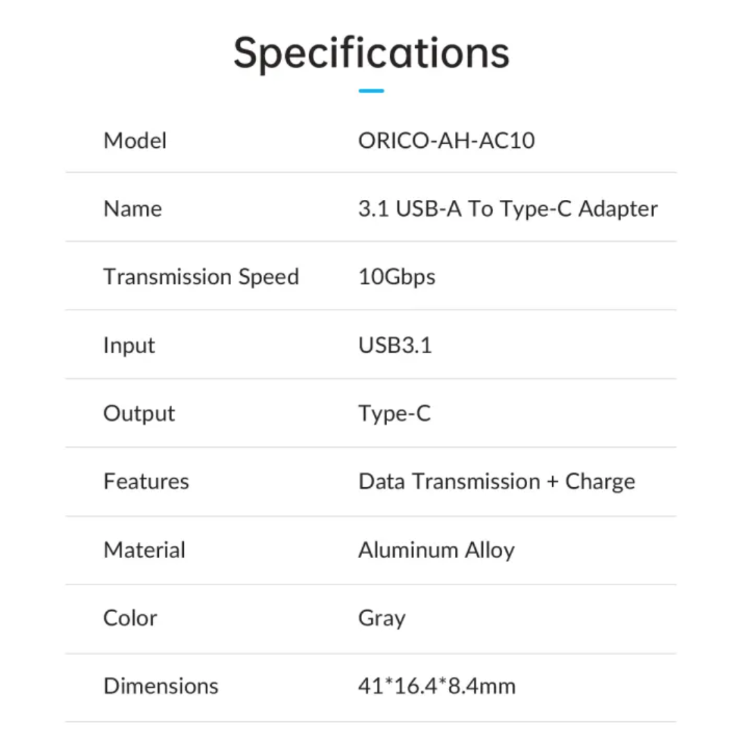 | Summary | ORICO AH-AC10 USB3.1 to Type-C Adapter✅ The versatile ORICO AH-AC10 USB 3.1 to Type-C HUB is now available at Newaz Enterprise! Seamlessly bridge the gap between devices, and experience lightning-fast data transfer and charging capabilities like never before. br This high-performance adapter is designed to work seamlessly with a wide range of devices, including laptops, smartphones, tablets, and more. br Harness the power of USB 3.1 technology to transfer files and data at mind-boggling speeds. Enjoy rapid data transfers, reducing wait times significantly.✅ The ORICO AH-AC10 USB3.1 to Type-C Adapter is a high-performance connectivity solution designed to bridge the gap between traditional USB devices and modern Type-C ports. Available at Newaz Enterprise, this premium adapter ensures seamless compatibility with laptops, desktops, smartphones, tablets, and other USB-enabled devices. Built with advanced USB 3.1 technology, it delivers ultra-fast data transfer speeds and stable connections for both professional and personal use. Whether you need to connect peripherals, transfer large files, or sync important documents, this adapter offers reliable and efficient performance. Its plug-and-play functionality eliminates complex installation processes, making it user-friendly and instantly operational.✅ Experience lightning-fast data transmission with transfer speeds of up to 10Gbps, significantly reducing waiting time when moving high-resolution videos, large documents, or software files. The ORICO AH-AC10 ensures superior bandwidth performance compared to older USB standards, making it ideal for power users, content creators, office professionals, and gamers. With USB 3.1 support, this adapter enhances productivity by providing stable and uninterrupted connectivity. The built-in LED indicator light clearly displays the working status, giving users visual confirmation of power and data activity. This ensures safe and efficient usage across various devices without compromising performance.✅ Charging performance is equally impressive, as the ORICO USB3.1 to Type-C Adapter supports up to 2A current output for rapid and stable charging. Keep your smartphones, tablets, and other USB-C devices powered efficiently while maintaining consistent data synchronization. Designed with durability in mind, the adapter features a premium aluminum alloy body that enhances heat dissipation and protects against daily wear and tear. The sturdy construction ensures long-term reliability, making it an excellent investment for professionals and tech enthusiasts who require dependable connectivity solutions for everyday tasks.✅ The compact and lightweight design of the ORICO AH-AC10 makes it highly portable and travel-friendly. Measuring just 41 × 16.4 × 8.4 mm, it easily fits into your pocket, laptop bag, or tech organizer. Its sleek silver finish adds a modern and professional look, perfectly complementing contemporary devices. The plug-and-play design requires no additional drivers or software installation, making it universally convenient for Windows, macOS, and other compatible operating systems. Simply connect the adapter to your Type-C port and instantly expand your device’s compatibility with standard USB interfaces.✅ With a 12-month warranty and ORICO’s trusted build quality, the AH-AC10 adapter ensures safety, durability, and long-lasting performance. It supports multiple device connections and maintains stable voltage output of up to 12V for secure operations. Whether you are upgrading your workspace, enhancing mobile productivity, or looking for a reliable USB-C conversion solution, the ORICO AH-AC10 USB3.1 to Type-C Adapter is the perfect choice. Order now from www.newazenterprise.com and upgrade your connectivity with confidence and cutting-edge technology. ✅ Keep your devices powered up and ready for action. br The adapter supports rapid charging, ensuring your gadgets are always juiced up when needed. ORICO's commitment to quality ensures a durable and sturdy design that can withstand everyday wear and tear, making it a long-lasting addition to your tech arsenal. ✅ Do not forget about complicated installations or software updates. Simply plug the adapter into your Type-C port, and you're ready to go! br With its compact and lightweight design, the ORICO USB 3.1 to Type-C Adapter is your ideal travel companion, offering enhanced connectivity on the go. Don't miss out on this must-have tech accessory.* Plug and play driver-free installation* Supports rapid 2A stable charging output* Universal compatibility with Type-C devices* Durable premium aluminum alloy body design* Ultra-fast 10Gbps high-speed data transmission* Compact lightweight travel-friendly portable adapter✅ SPECIFICATIONS:* Model: AH-AC10* Brand: Orico* Material: Aluminum Alloy* Colour: Grey* USB Support: USB 3.1* Material: Aluminum Alloy* Interface: USB3.1+Type-C* Transmission rate: 10Gbps* Charging: 5V3A* Dimension: 41*16.4*8.4mm* Warranty; 12 Month .. | ORICO AH-A13-GY-BP USB A to USB 3.0 4 Port Aluminum Hub ✅ Enhance Your USB Connectivity with the ORICO AH-A13-GY-BP USB A to USB 3.0 4-Port Aluminum Hub. This sleek and durable hub allows you to expand your USB capabilities, offering four high-speed USB 3.0 ports for connecting multiple devices to your computer or laptop. Whether you need to connect external hard drives, USB flash drives, printers, keyboards, or mice, the AH-A13-GY-BP delivers fast data transfer speeds of up to 5Gbps, ensuring efficient file management and smooth device operation. ✅ The ORICO AH-A13-GY-BP Hub is ideal for users who need to maximize their USB ports without compromising on performance or style. Its premium aluminum construction not only provides a sophisticated, modern look but also helps dissipate heat effectively, ensuring long-term, stable performance. Whether you're working in an office, at home, or on the go, this compact hub is designed to meet your everyday conne